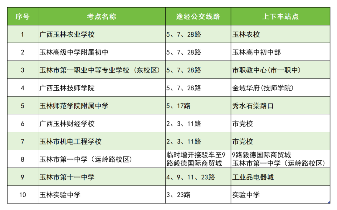 9路毅德國(guó)際商貿(mào)城站點(diǎn)7:30-9:00,13:00-14:00 在站點(diǎn)安排車輛和值勤人員,負(fù)責(zé)將考生送到玉林市第一中學(xué)(運(yùn)嶺路校區(qū))考點(diǎn)。