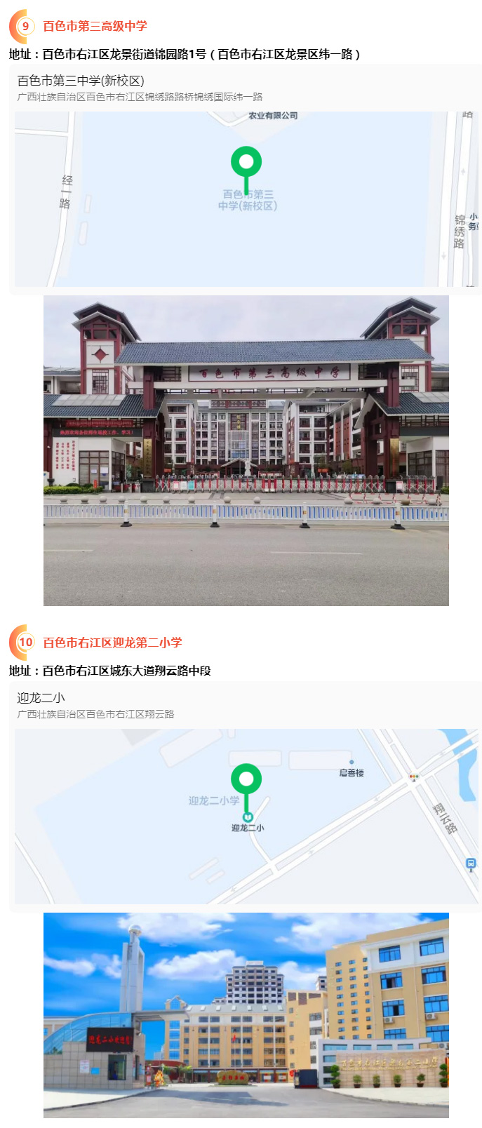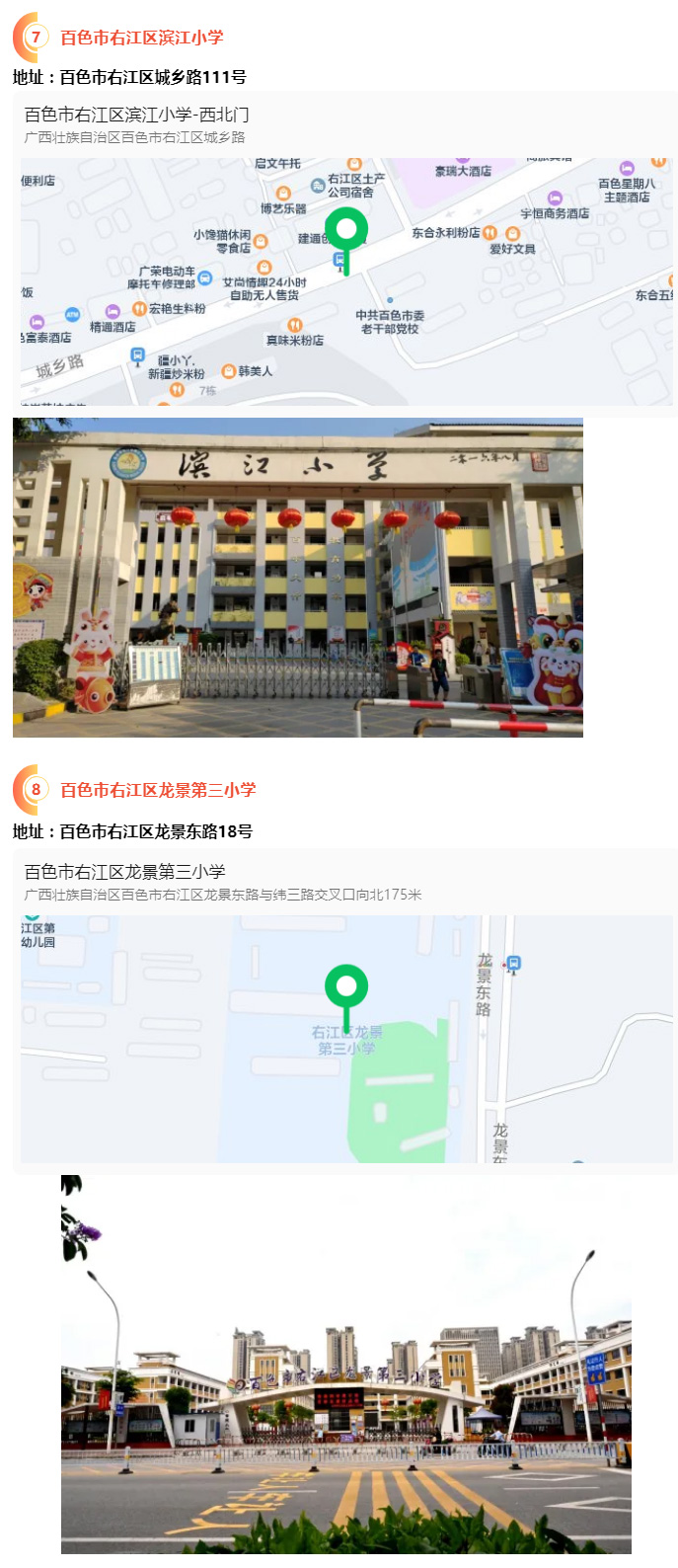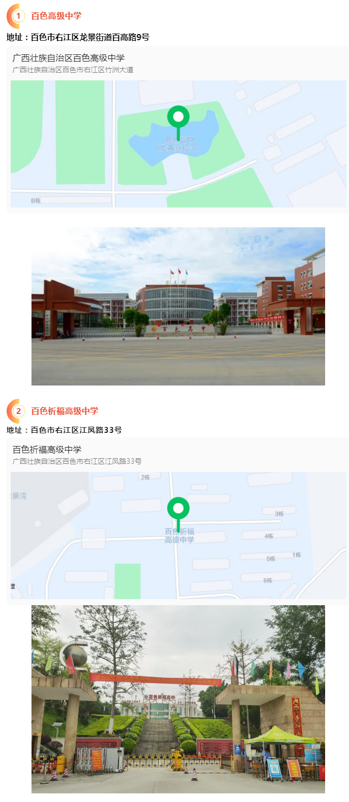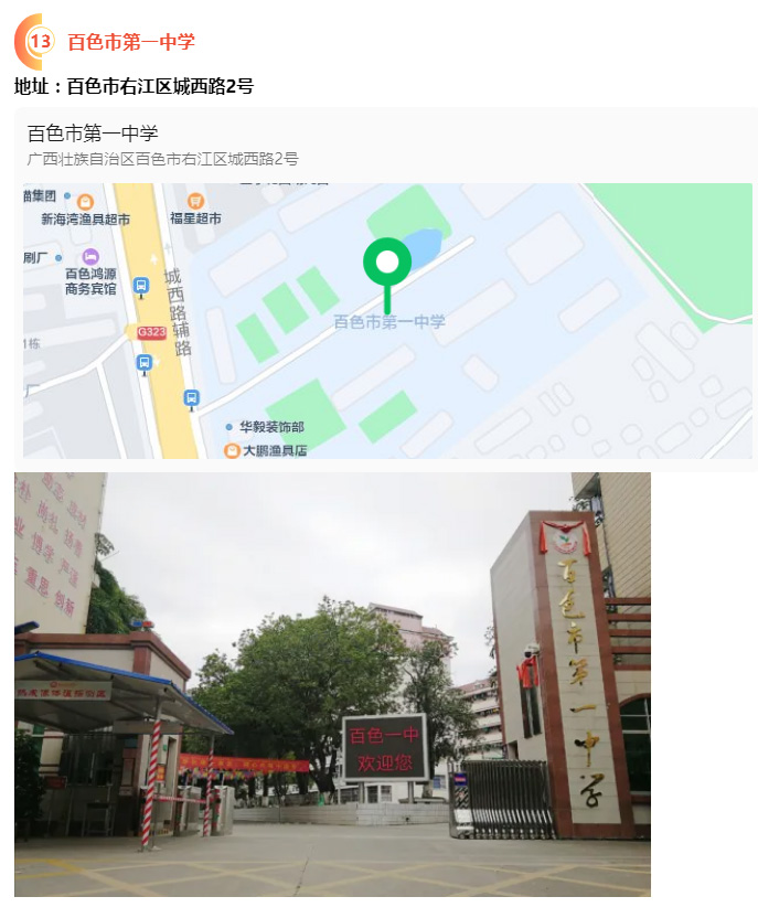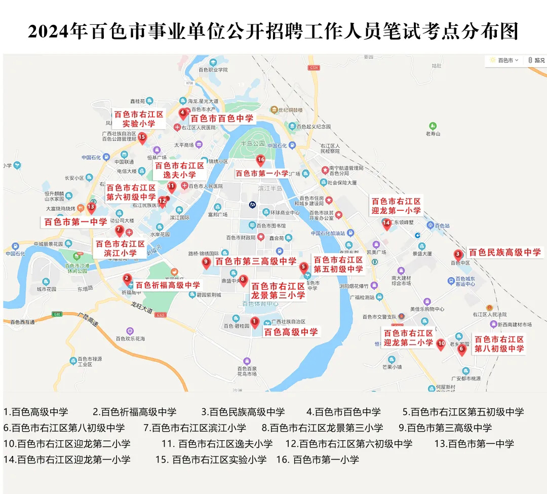 2.請?zhí)崆笆煜た键c地址,做好路線、住宿的安排。本次考試參考人數(shù)較多,考點分布分散,建議考生考前實地察看考點,確認(rèn)考點入口位置,防止走錯考點。請充分考慮考點周邊交通通行情況和停車場地容量,合理安排出行方式,預(yù)留充足時間,確??荚嚠?dāng)天按時到達。另外,考試期間百色市及各考點學(xué)校周邊的住宿比較緊張,請?zhí)崆邦A(yù)定。