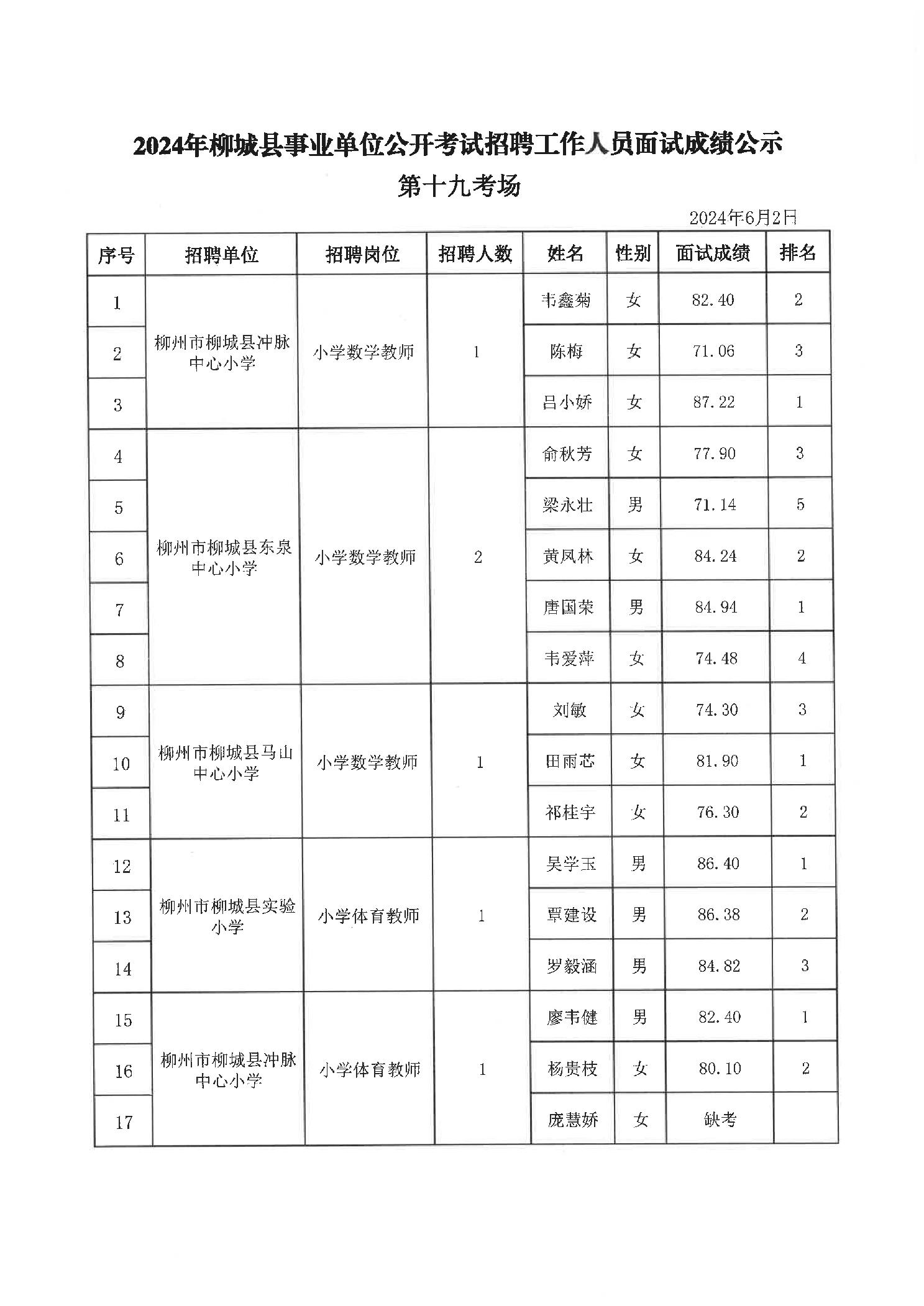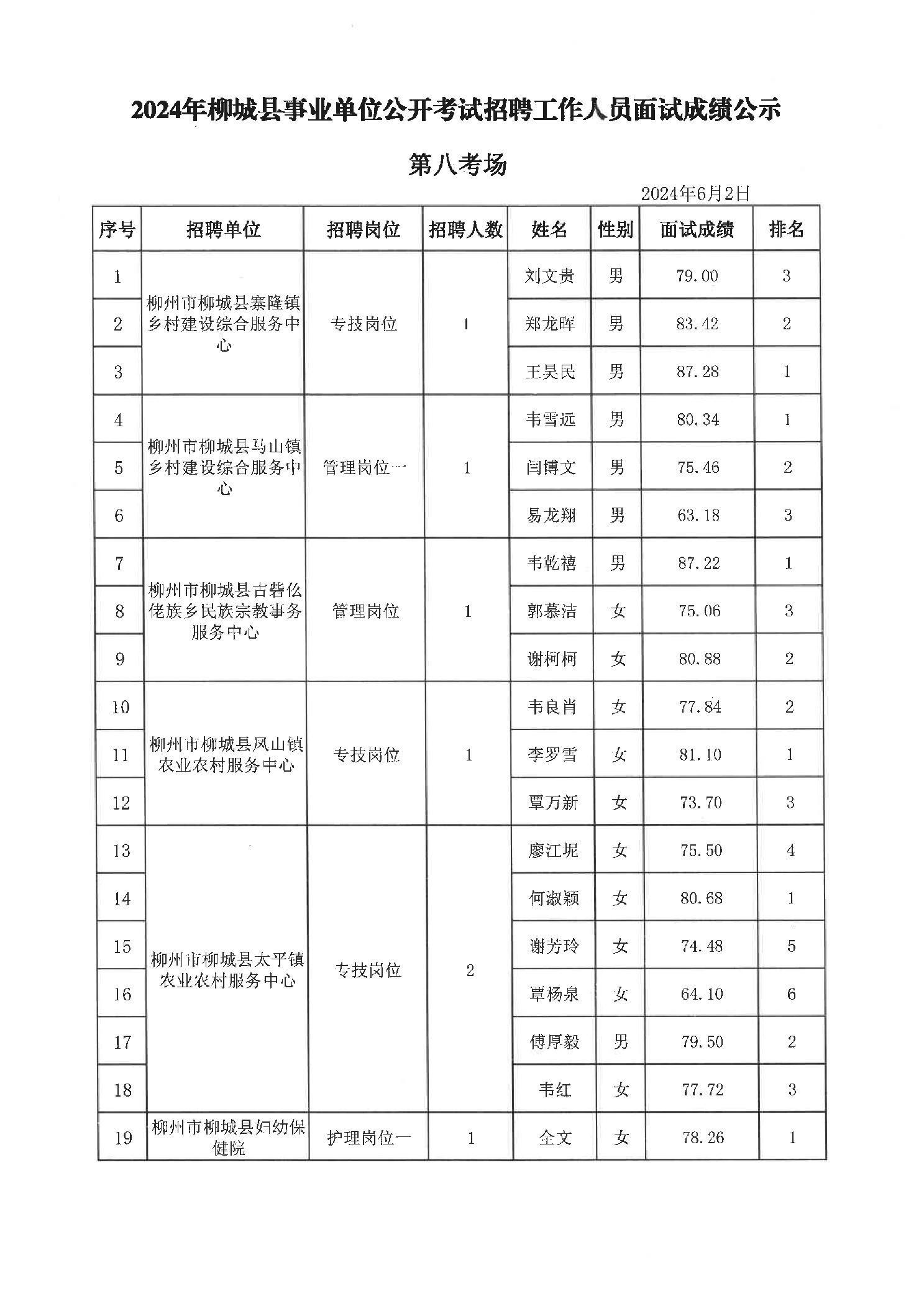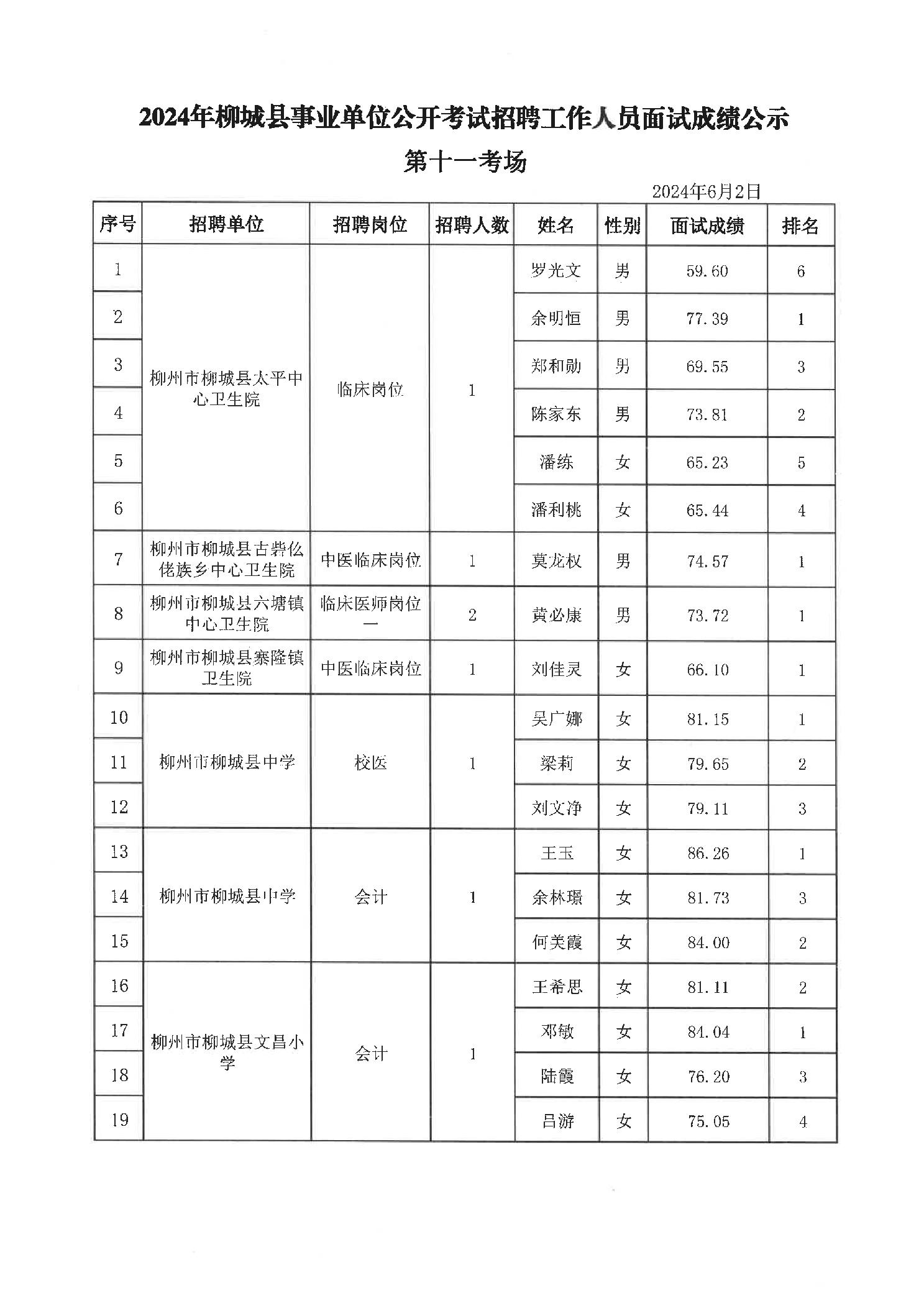 2024年柳城縣事業(yè)單位公開考試招聘工作人員面試成績(jī)公示