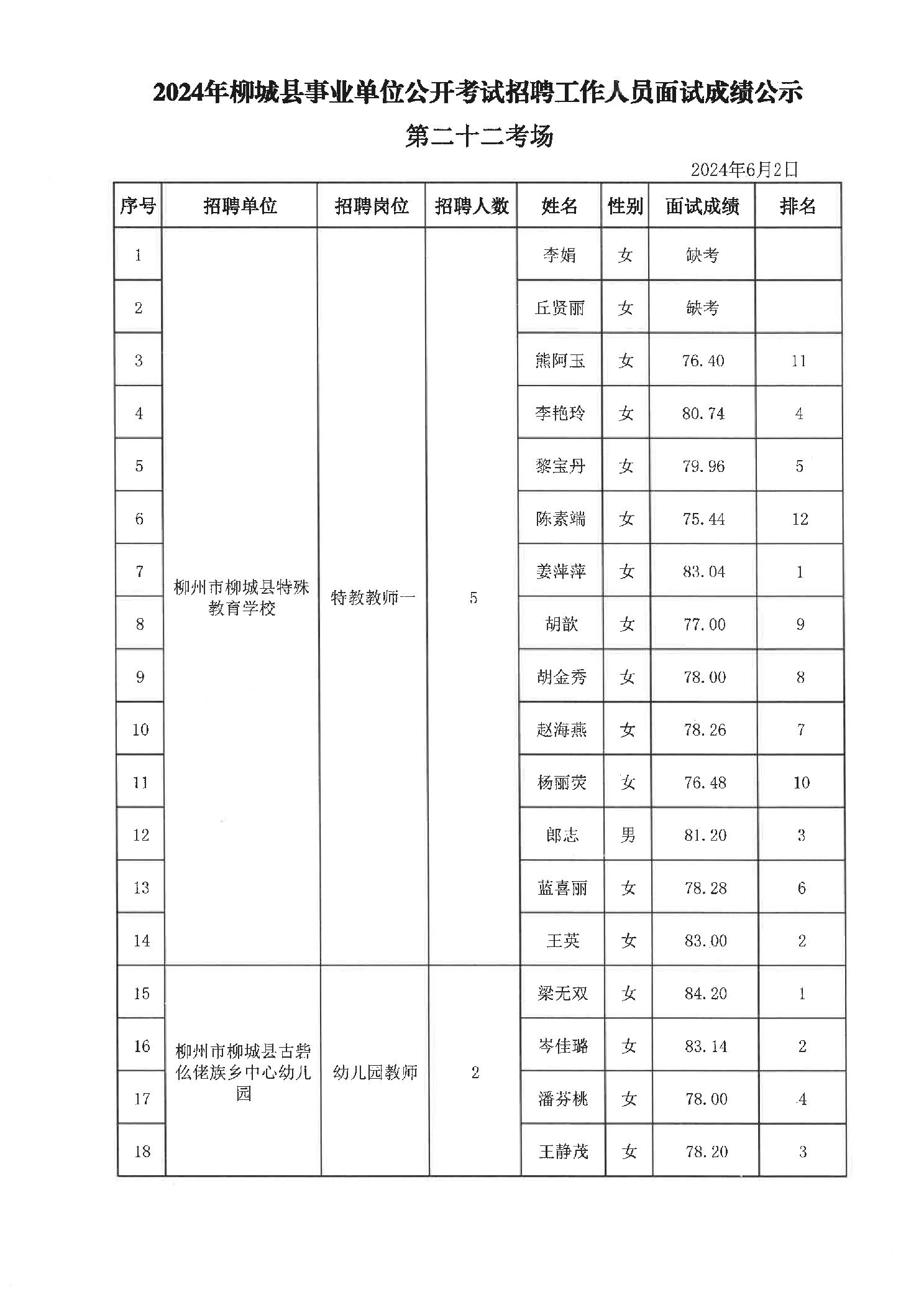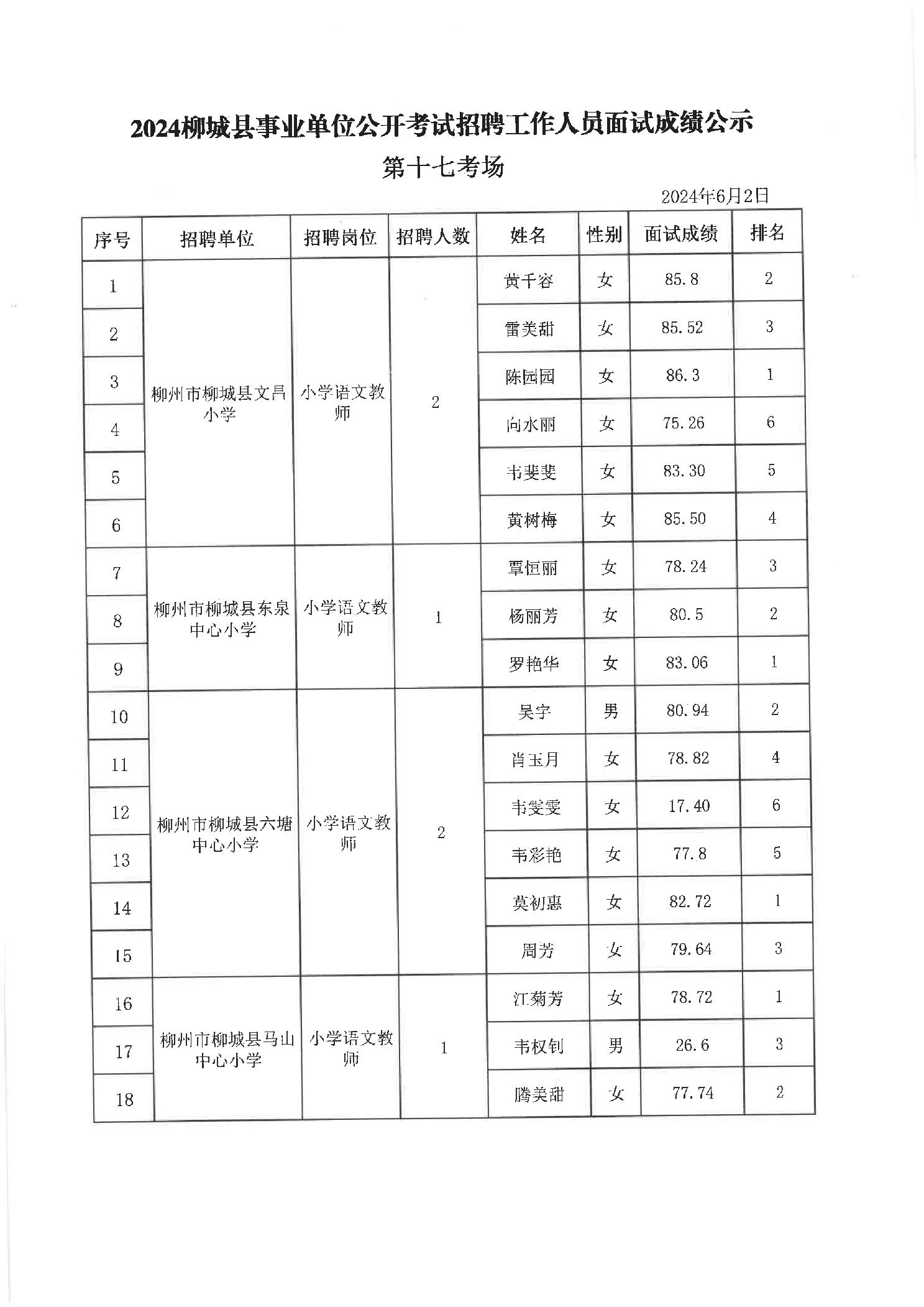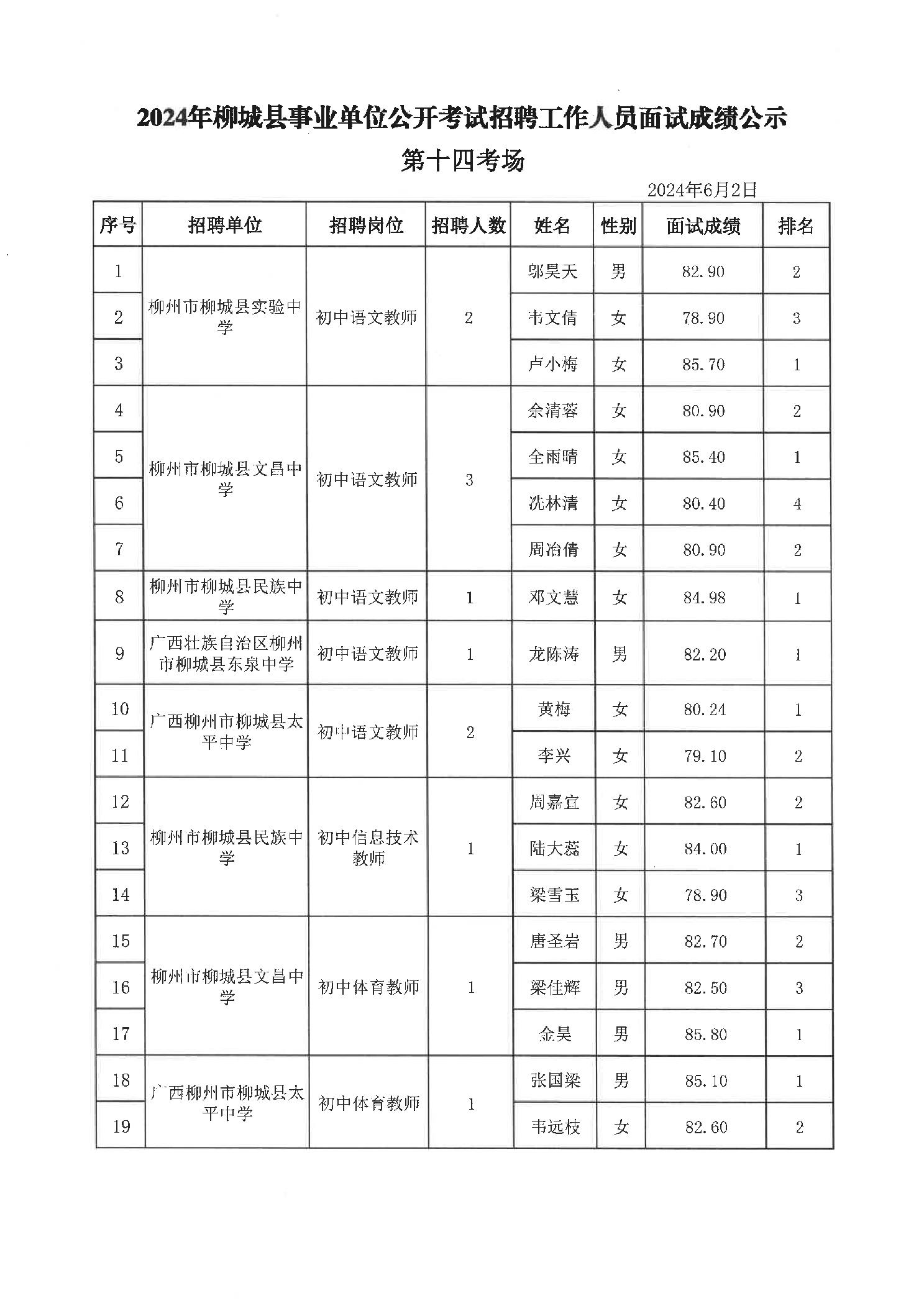 2024年柳城縣事業(yè)單位公開考試招聘工作人員面試成績(jī)公示