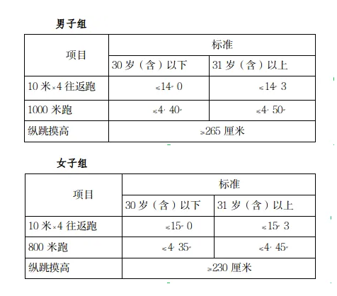 參照《關(guān)于印發(fā)公安機(jī)關(guān)錄用人民警察體能測評項目和標(biāo)準(zhǔn)(暫行)的通知》(人社部發(fā)〔2011〕48號)的項目及測試規(guī)則,結(jié)合《公安民警體育鍛煉達(dá)標(biāo)手冊》成績標(biāo)準(zhǔn),本次體能測評的項目和標(biāo)準(zhǔn)如下: