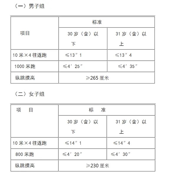 報考人員須參加全部三項(xiàng)體能測評,全部達(dá)標(biāo)方為合格,如放棄一項(xiàng)則視為不合格,體能測評合格的方可進(jìn)入下一環(huán)節(jié)。