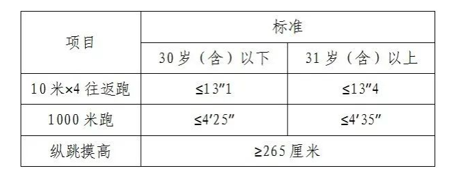 參加者凡有其中一項不達標或放棄,視為體能測評不合格。體能測評合格,方可進入下一環(huán)節(jié)。體能測評項目中,縱跳摸高的測評次數不超過3次,往返跑的測評次數不超過2次,長跑測評次數僅為1次。