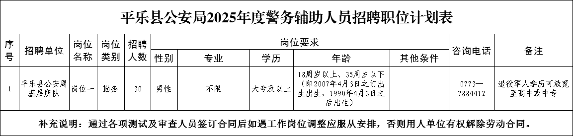 1.對確定聘用的人員,與平樂縣公安局簽訂勞動合同(合同期限為三年,試用期不超過6個月)。平樂縣公安局按照有關規(guī)定組織崗前培訓,凡在崗前培訓及試用期內不合格者,按照《中華人民共和國勞動合同法》相關規(guī)定,解除勞動合同。對擬簽訂合同的人員,非不可抗拒原因自愿放棄的,列入警務輔助人員招聘“黑名單”,之后不再聘用。對簽訂合同的人員,統(tǒng)一由縣局安排工作;不服從安排的,經調劑后,仍不服從安排的,將解除合同,同時列入警務輔助人員招聘“黑名單”,之后不再聘用;