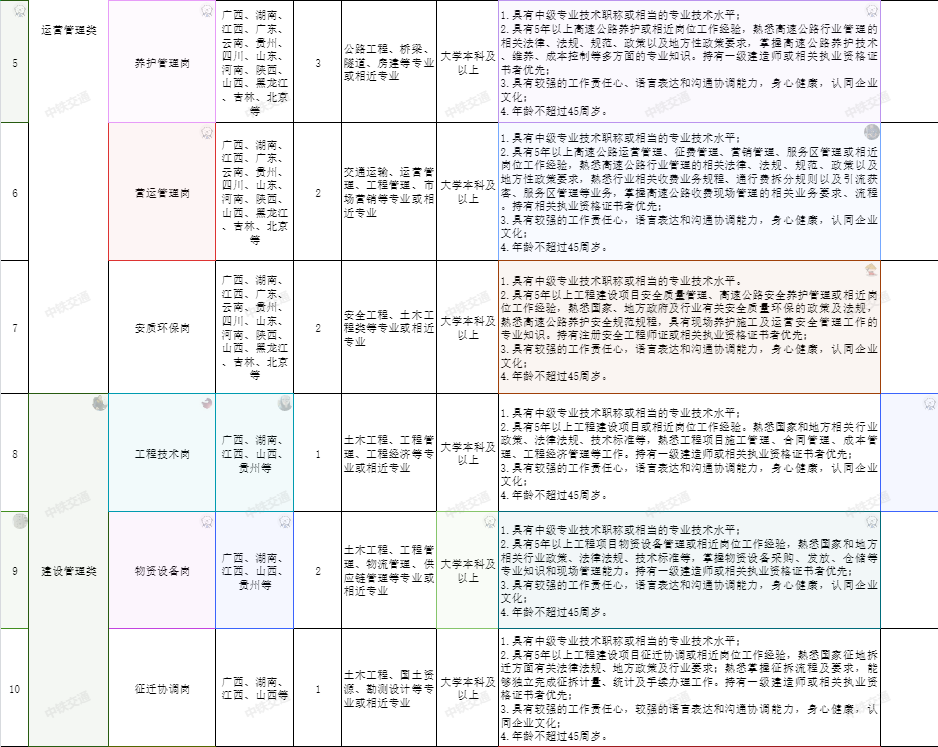 運營管理類:集團公司本部運營管理部副部長;機電維護崗;養(yǎng)護管理崗;營運管理崗;安質(zhì)環(huán)保崗