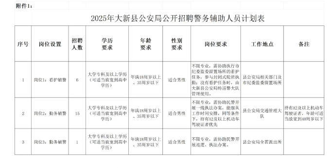 為適應(yīng)當(dāng)前社會(huì)治安形勢(shì)的需要,進(jìn)一步充實(shí)公安機(jī)關(guān)警務(wù)輔助力量,推進(jìn)平安大新建設(shè),有效維護(hù)社會(huì)治安穩(wěn)定,根據(jù)《廣西壯族自治區(qū)公安機(jī)關(guān)警務(wù)輔助人員條例》《崇左市公安機(jī)關(guān)警務(wù)輔助人員管理辦法》《崇左市公安機(jī)關(guān)警務(wù)輔助人員管理招聘管理辦法》(試行)等文件精神,經(jīng)縣人民政府同意,大新縣公安局決定面向社會(huì)公開招聘警務(wù)輔助人員22名(以下簡(jiǎn)稱輔警)。現(xiàn)將有關(guān)事項(xiàng)公告如下:
