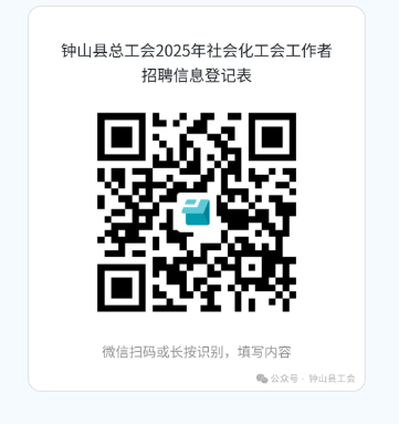 2.報(bào)名方式:采取網(wǎng)上報(bào)名方式報(bào)名。報(bào)名時(shí)間截止前,有意者請根據(jù)附件1填寫個(gè)人簡歷,并用微信掃描下方二維碼打開小程序填寫《鐘山縣總工會(huì)2025年社會(huì)化工會(huì)工作者招聘信息登記表》,上傳個(gè)人簡歷、身份證掃描件、學(xué)歷證書掃描件、學(xué)信網(wǎng)教育部學(xué)歷證書電子注冊備案表、榮譽(yù)證書掃描件、發(fā)表文章等佐證材料,逾期不再接收任何報(bào)送材料。