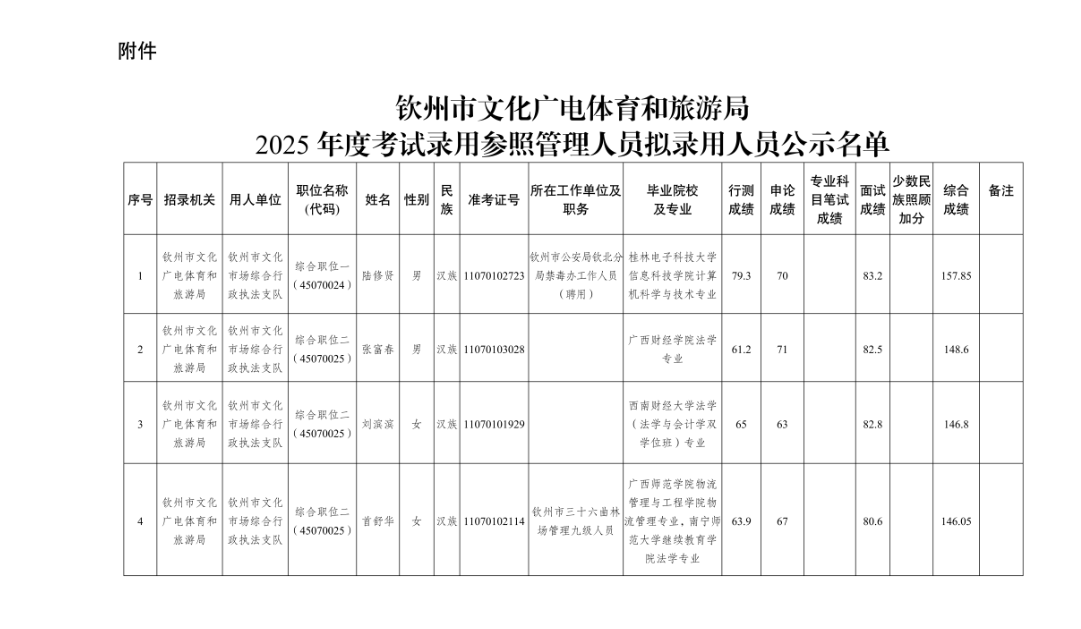 根據(jù)《廣西壯族自治區(qū)2025年度考試錄用公務(wù)員公告》等有關(guān)規(guī)定,我單位2025年計(jì)劃招錄4名參照管理人員,經(jīng)過公開報(bào)名、資格審查、筆試、面試、體檢、考察等程序,擬錄用陸修賢等4位同志(附件)為參照管理人員,現(xiàn)予以公示。公示期5個(gè)工作日,如對擬錄用人員的錄用資格有異議,請?jiān)诠酒趦?nèi)向欽州市文化廣電體育和旅游局人事科實(shí)名反映。