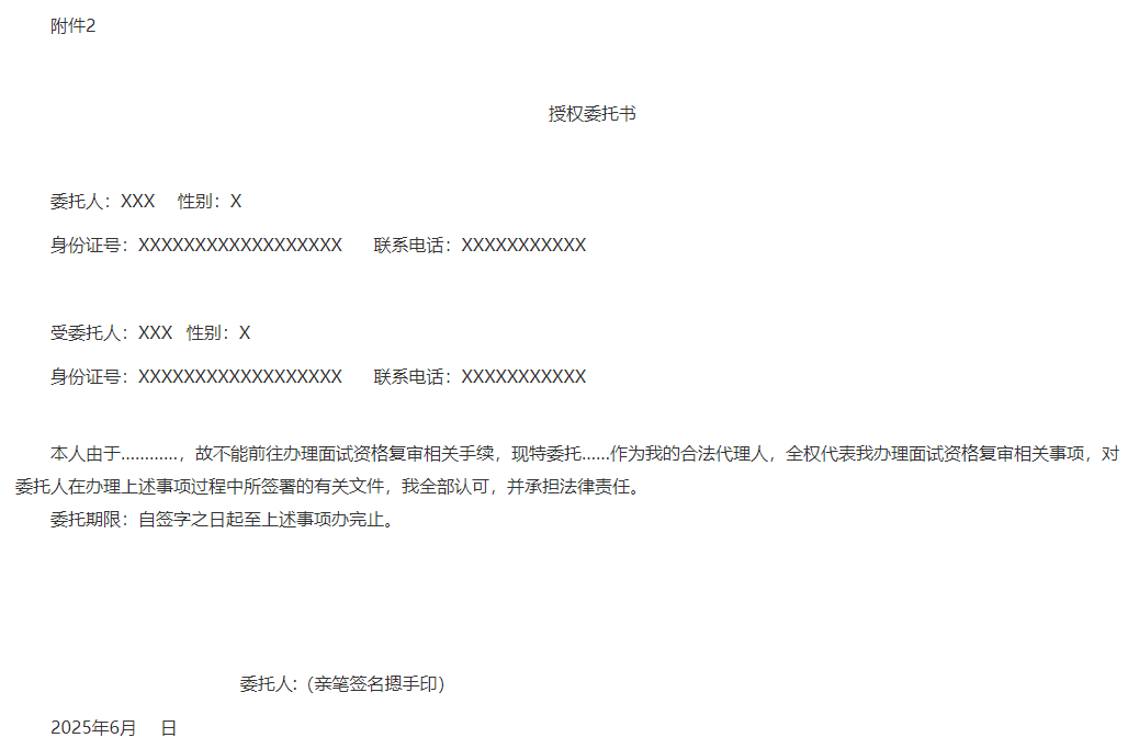 (二)面試資格復(fù)審一般應(yīng)由報(bào)考人員本人參加。因特殊原因需由他人代為參加面試資格復(fù)審的,須由報(bào)考人員出具委托書(委托書應(yīng)有委托人、受托人的姓名和身份證號(hào)碼,委托原因和代辦事項(xiàng),委托人親筆簽名等,詳見附件2),經(jīng)面試復(fù)審單位同意后,可以委托代理。