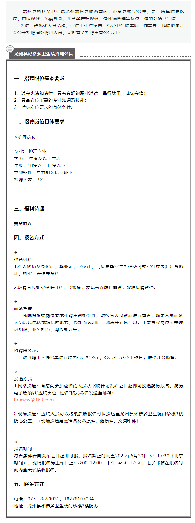 龍州縣彬橋鄉(xiāng)衛(wèi)生院招聘公告