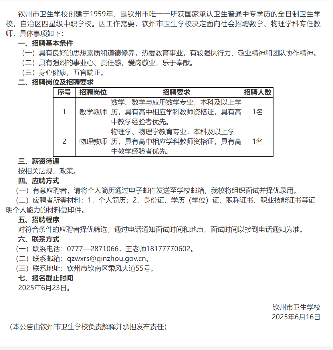 欽州市衛(wèi)生學(xué)校2025年公開(kāi)招聘數(shù)學(xué)、物理學(xué)科專任教師公告