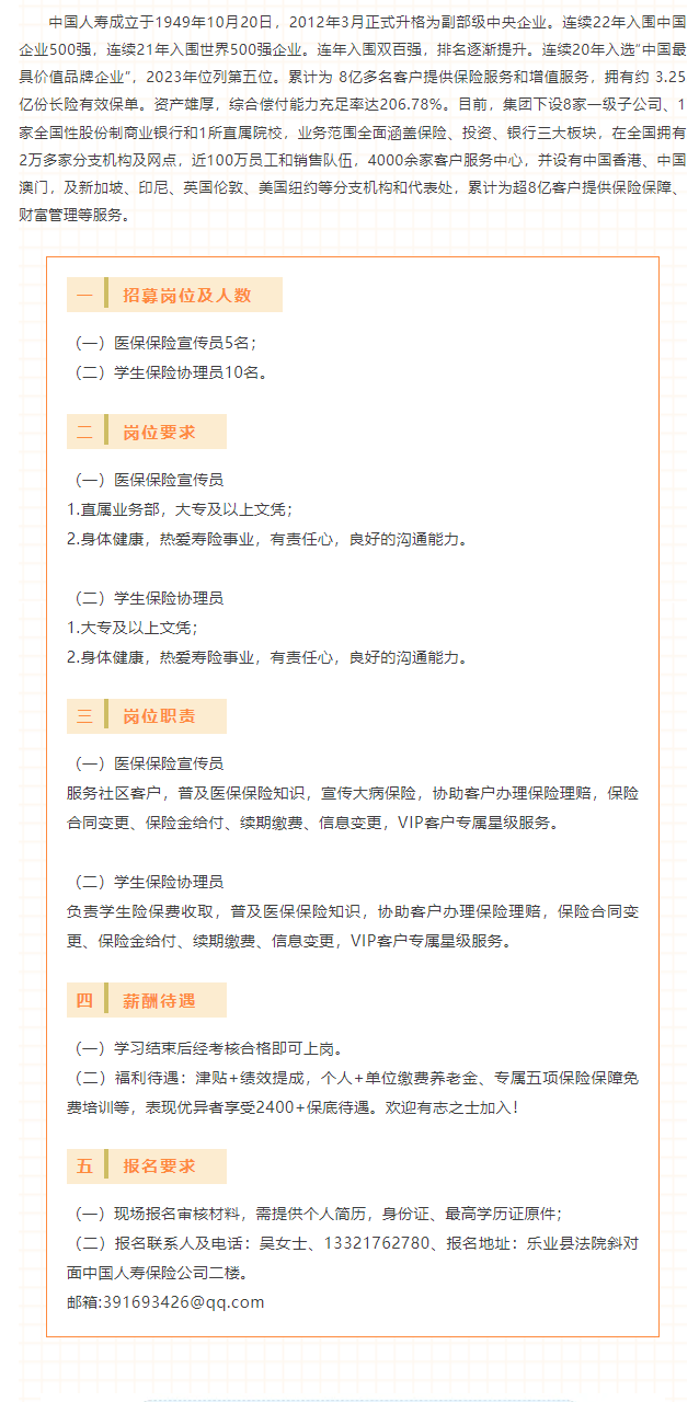 中國人壽保險股份有限公司樂業(yè)支公司招募工作人員15名