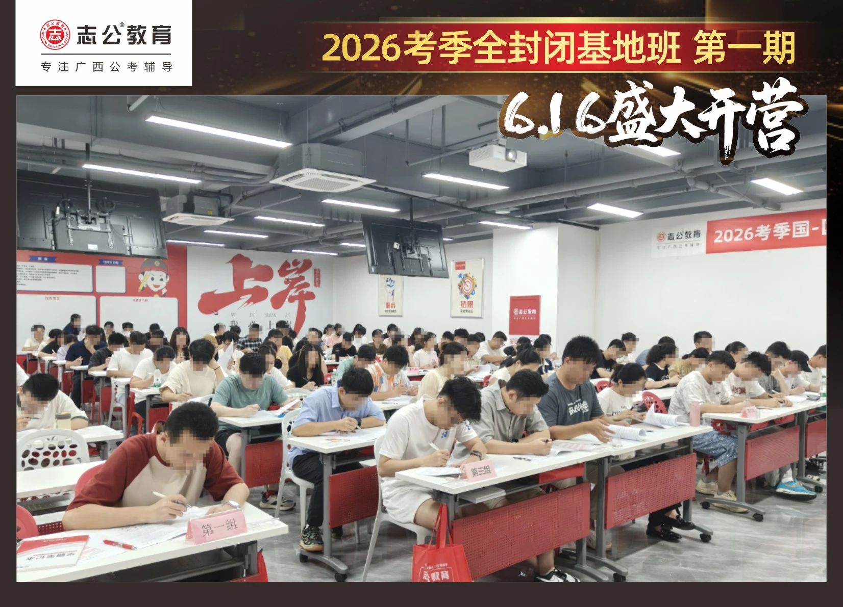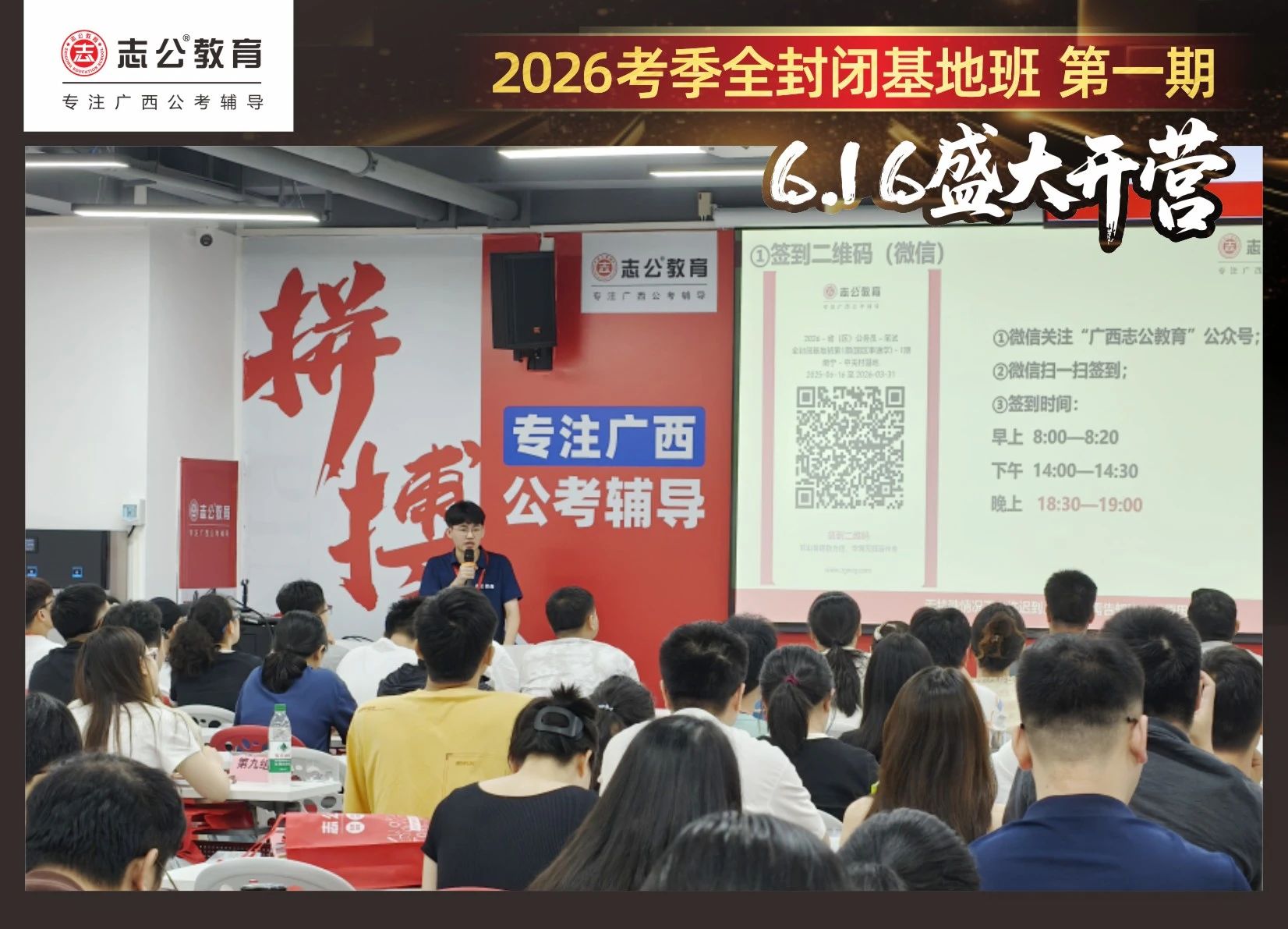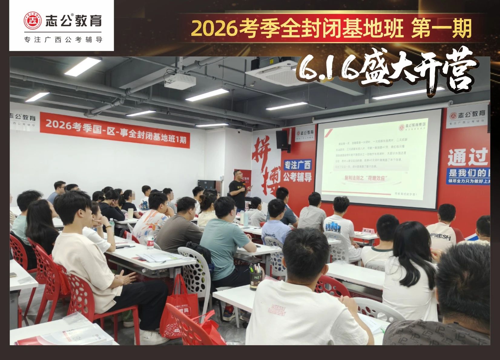 大家稍作休息之后,就是咱們期待已久的開(kāi)班典禮啦!學(xué)員們?cè)诎嘀魅蔚囊龑?dǎo)下分組就坐。大家目光灼灼,熱情高漲,迫不及待想要開(kāi)啟學(xué)習(xí)模式??催@座無(wú)虛席的盛況,志公26考季全封閉基地班第1期課程實(shí)力名不虛傳,各位學(xué)員用飽滿的熱情和積極的態(tài)度迎接此次課程的開(kāi)展,期待大家能夠完成自己的蛻變和成長(zhǎng)!
