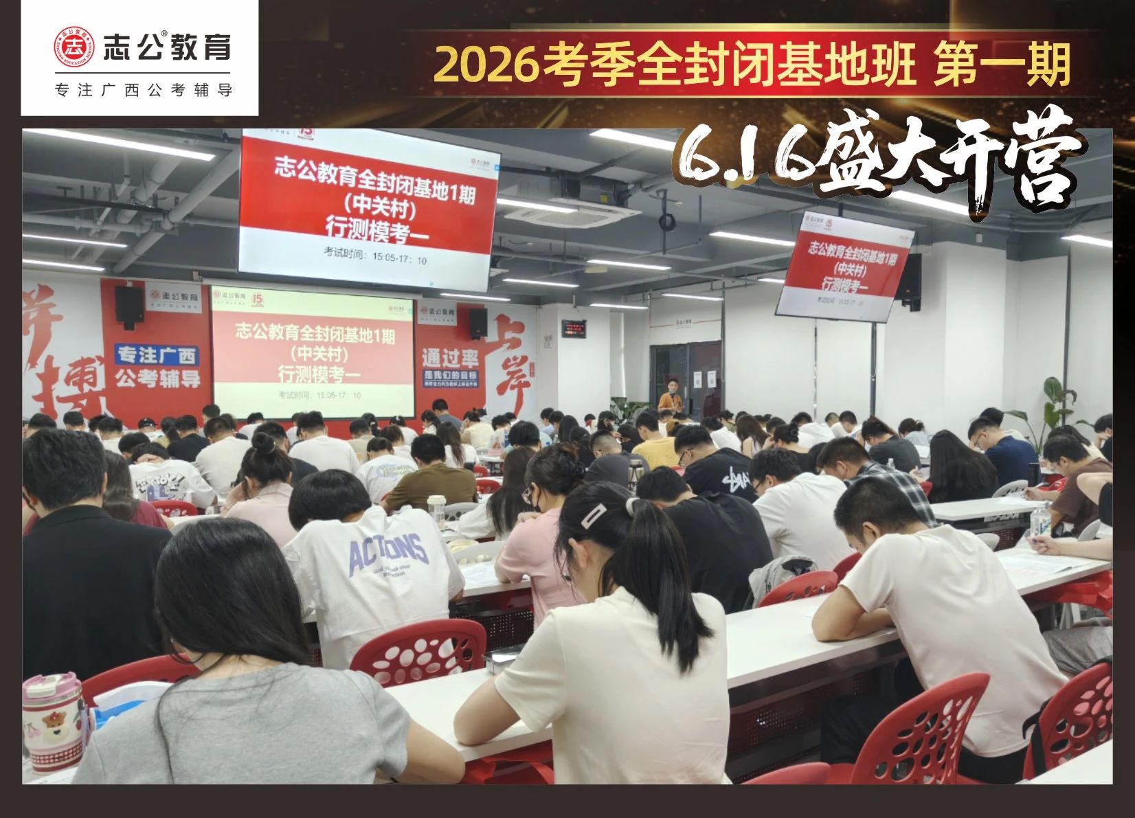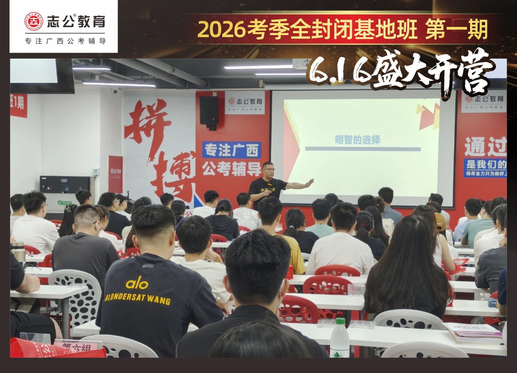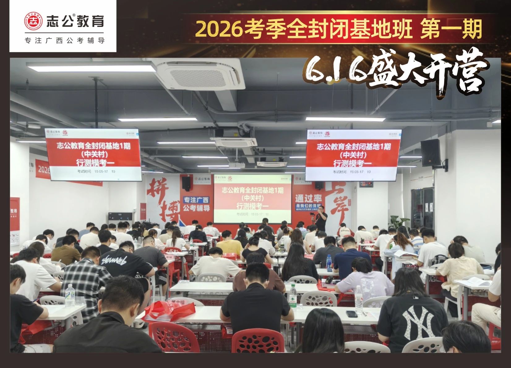 大家稍作休息之后,就是咱們期待已久的開(kāi)班典禮啦!學(xué)員們?cè)诎嘀魅蔚囊龑?dǎo)下分組就坐。大家目光灼灼,熱情高漲,迫不及待想要開(kāi)啟學(xué)習(xí)模式??催@座無(wú)虛席的盛況,志公26考季全封閉基地班第1期課程實(shí)力名不虛傳,各位學(xué)員用飽滿的熱情和積極的態(tài)度迎接此次課程的開(kāi)展,期待大家能夠完成自己的蛻變和成長(zhǎng)!