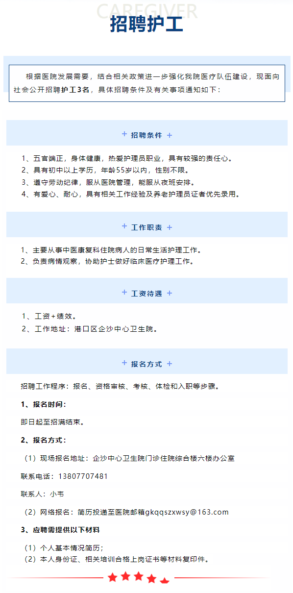 港口區(qū)企沙中心衛(wèi)生院招聘護工3人