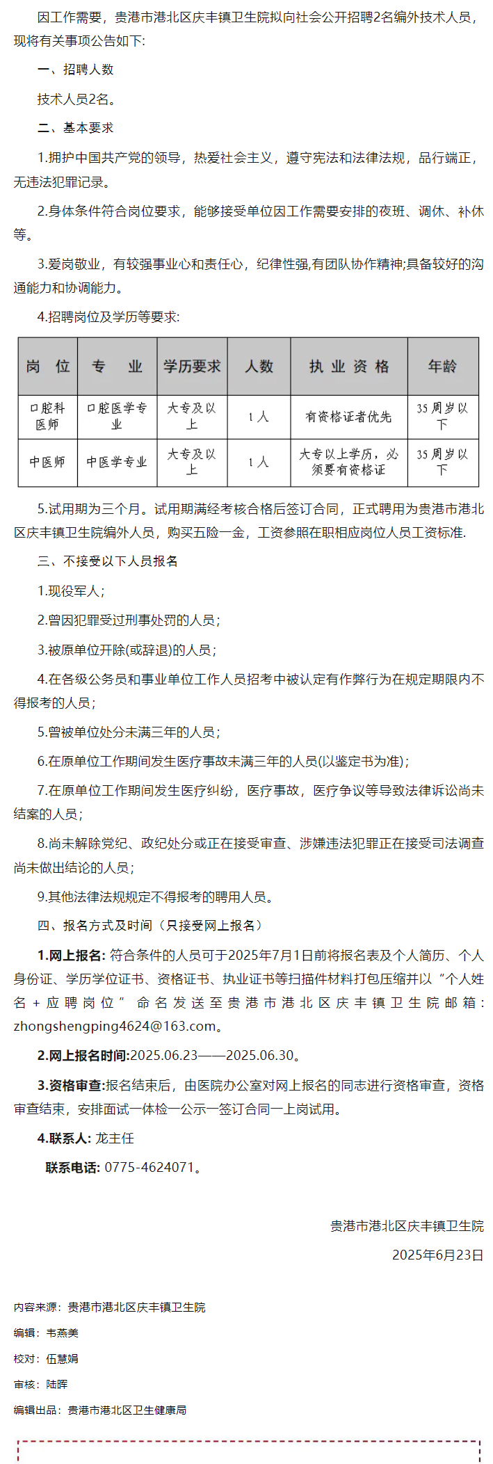 2025年貴港市港北區(qū)慶豐鎮(zhèn)衛(wèi)生院招聘編外技術人員2人