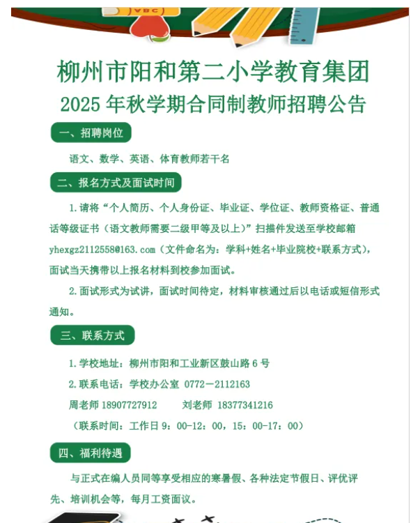 原文標(biāo)題:柳州市陽和第二小學(xué)教育集團(tuán)2025年秋學(xué)期合同制教師招聘公告