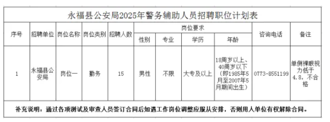 計劃招聘警務輔助人員15名。具體崗位、招聘人數(shù)、資格條件詳見《永??h公安局輔警招聘計劃表》。