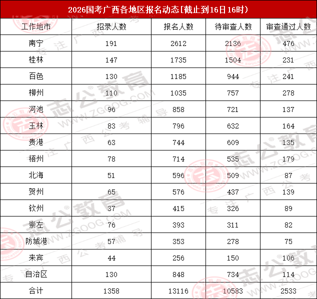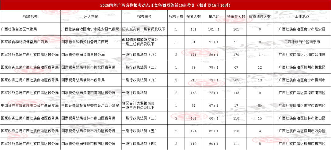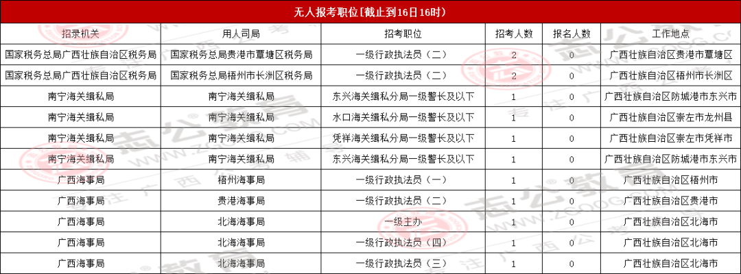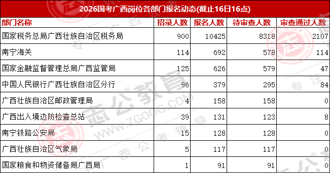 今天是報名第二天,小伙伴可要抓住此次上/岸機會啦!來看看廣西今天的報名數(shù)據(jù)吧。截止10月16日下午16:00,已經(jīng)有13116名考生報名,最熱崗220人報名!從各項數(shù)據(jù)來看,部分考生可能還持觀望態(tài)度。在接下來的報名時間里,可能會迎來報名人數(shù)大幅增長的情況,大家可以密切關(guān)注。