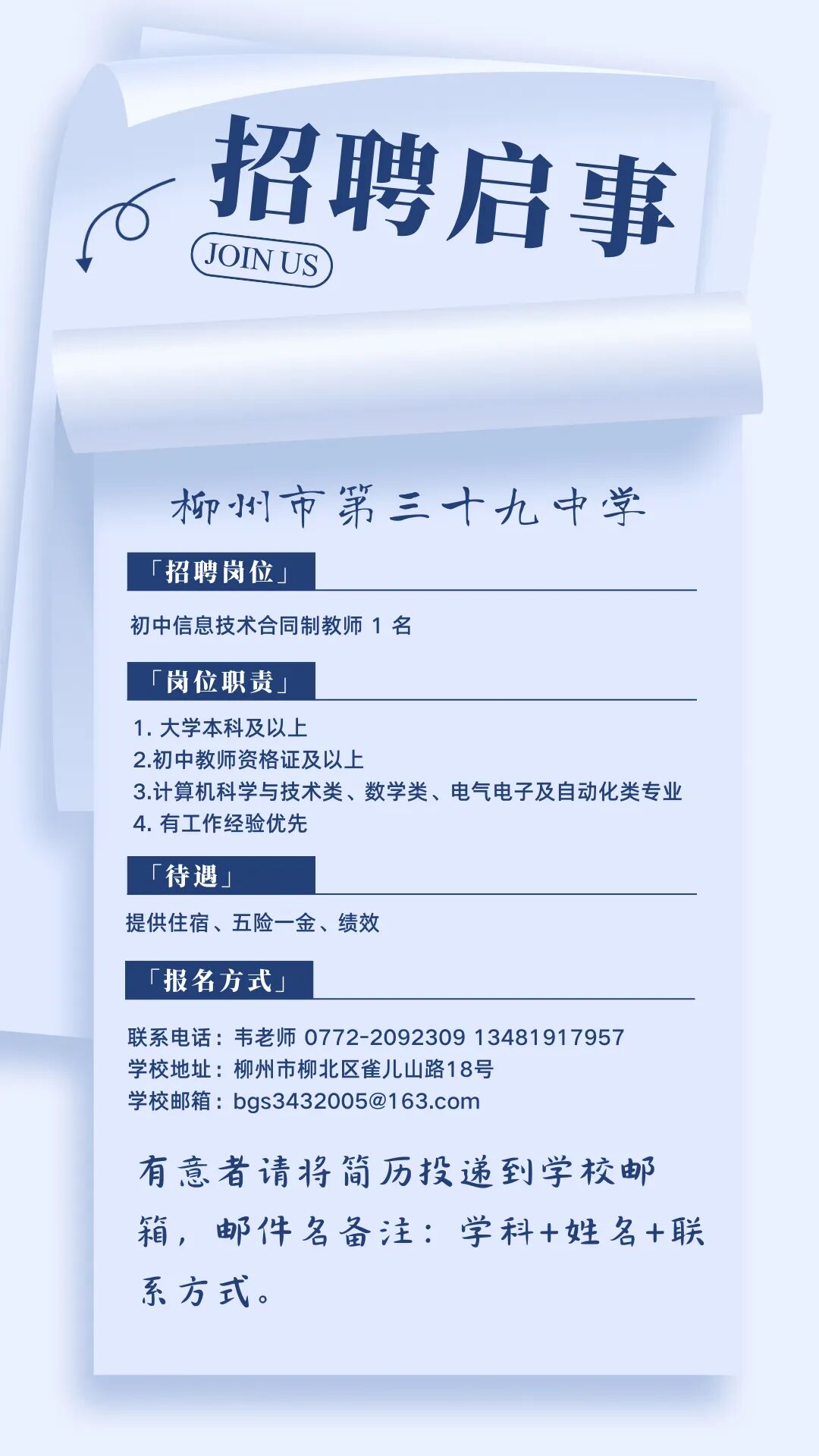 原文標(biāo)題:柳州市第三十九中學(xué)招聘初中信息技術(shù)合同制教師1名!