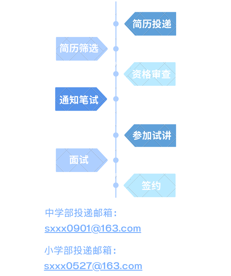 請將個人簡歷(Word或PDF版本)、一張個人生活照以電子郵件附件形式發(fā)送至報名崗位對應的郵箱(如有作品,請將作品集一起發(fā)送到報名郵箱),郵件主題和附件文件名請備注:應聘學科+姓名+畢業(yè)學校。
