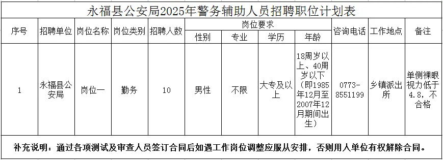對確定聘用的警務輔助人員與永福縣公安局簽訂勞動合同(合同期三年,試用期六個月,試用期滿經考核不適合崗位工作的,解除聘用合同),從事警務輔助工作。警務輔助人員依法履行輔助性工作職責,由公安機關管理使用、不具有人民警察身份,在公安機關及其人民警察的指揮和監(jiān)督下開展輔助性工作。