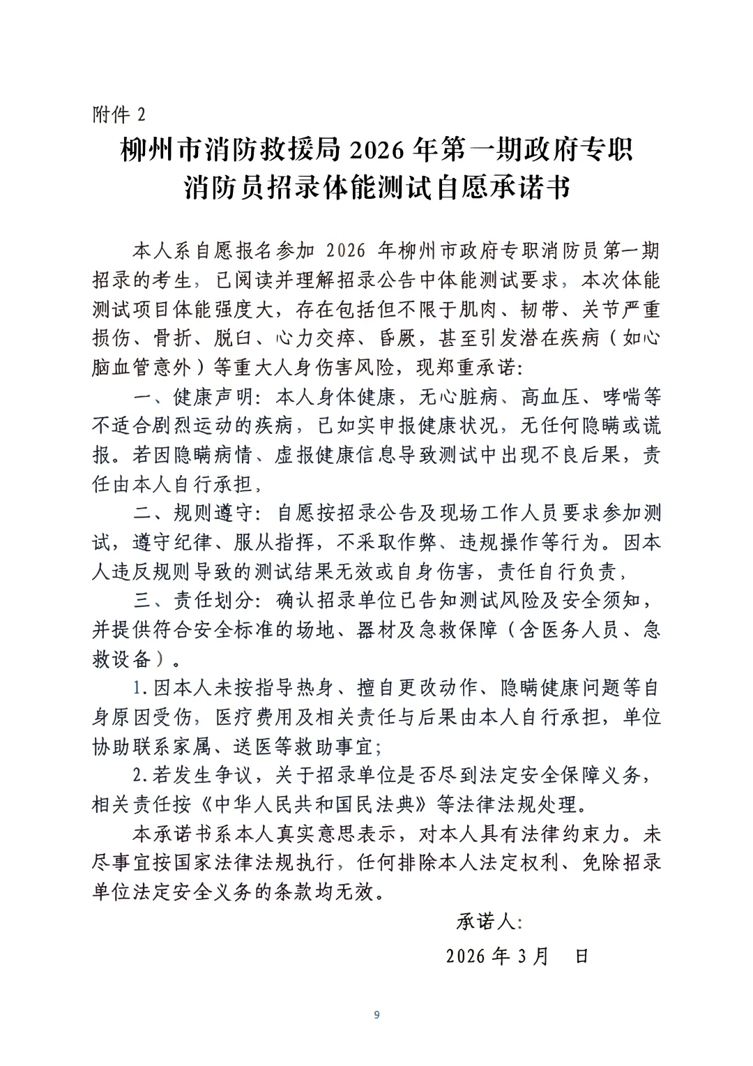 考生在體能測(cè)評(píng)前需簽署體能柳州市政府專職消防員第一期招錄體能測(cè)試承諾書(shū),拒絕簽署的不予進(jìn)行考核詳見(jiàn)(附件2)。