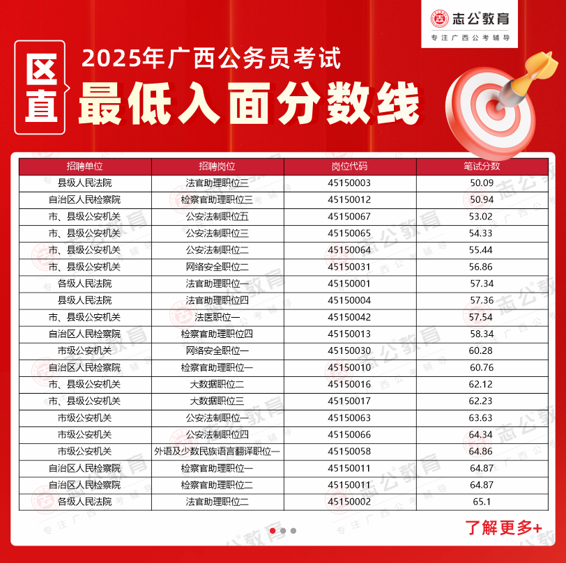 2025年廣西公務(wù)員考試筆試成績(jī)及面試入圍名單已公布。為幫助考生了解各單位招錄情況,本文根據(jù)官方發(fā)布的面試資格審查公告,整理了部分區(qū)直單位的進(jìn)面分?jǐn)?shù)數(shù)據(jù),供廣大考生在備考過程中進(jìn)行參考。